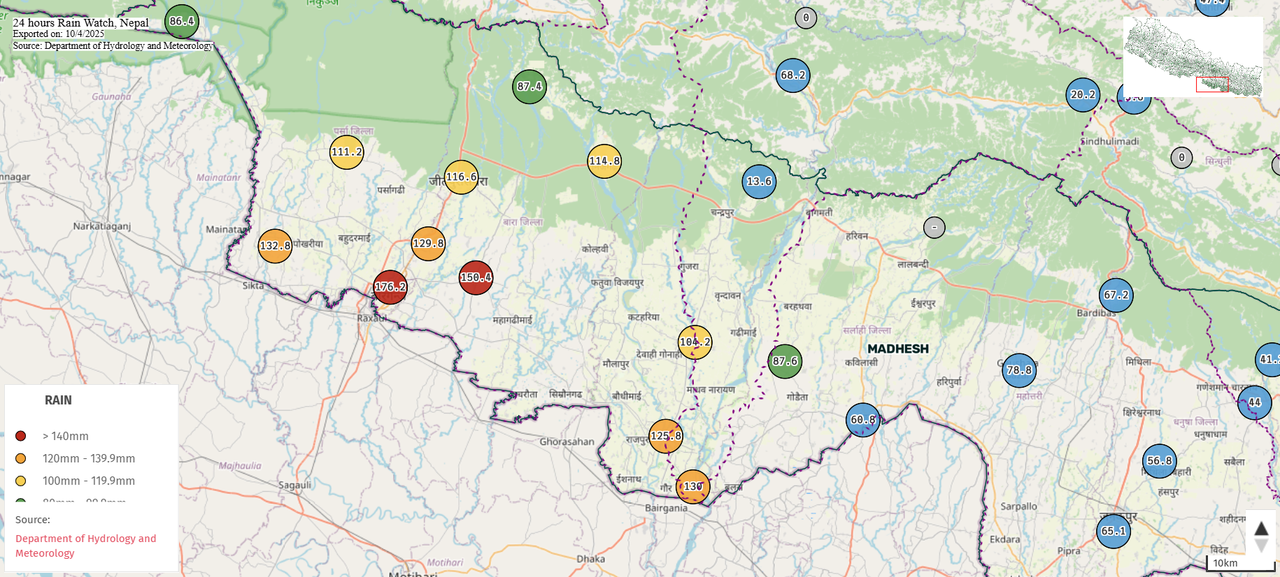 जल तथा मौसम विज्ञान विभागले वीरगञ्जमा पछिल्लो २४ घन्टामा १८२.६ मिलिमिटर वर्षा भएको उल्लेख गरेको छ। त्यस्तै कलैया केन्द्रमा १७६.४ मिलिमिटर वर्षा भएको छ। २४ घन्टामा १०० देखि २०० मिलिमिटरसम्म वर्षा भएमा धेरै भारी वर्षा भएको भन्ने गरिन्छ।