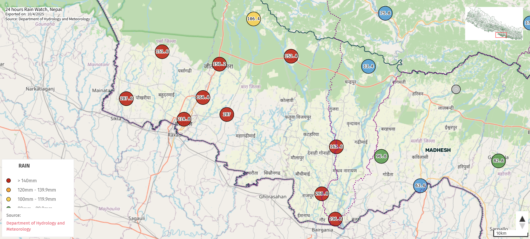 त्यहाँ पछिल्लो २४ घन्टामा २७०.४, गौरमा २४३.६, गरूडामा १९१.८, बाराको कलैयामा २१०.६ मिलिमिटर वर्षा भएको छ।