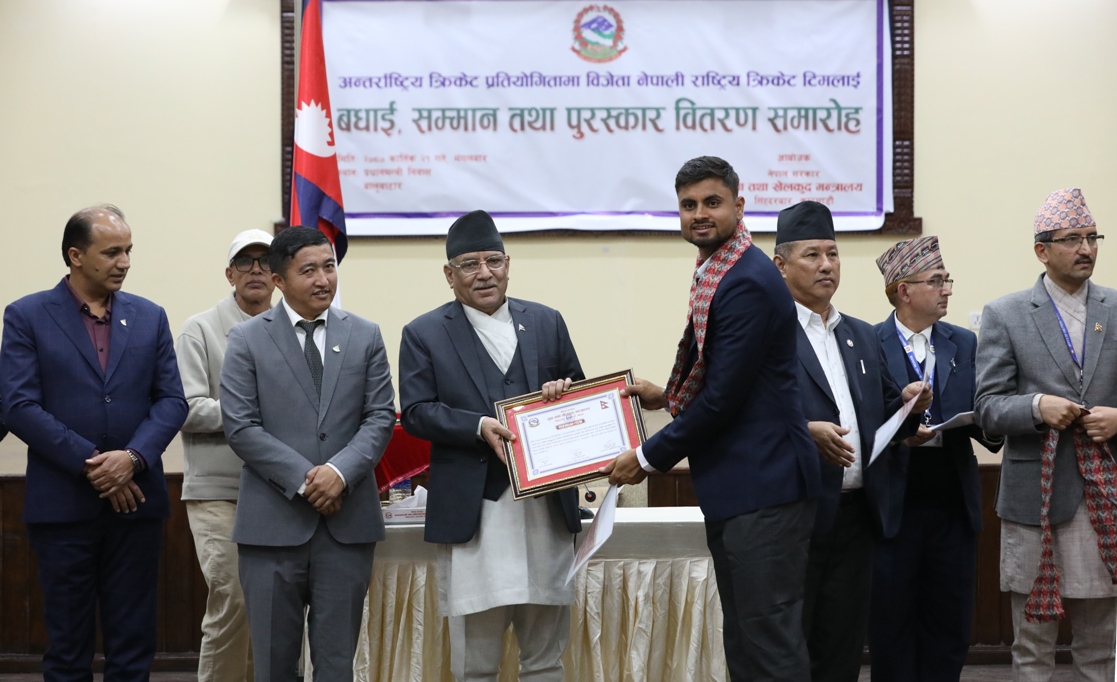 सोही अवसरमा गत आइतबार सम्पन्न आइसिसी पुरुष टी– २० विश्व कपको एसिया क्षेत्र छनोटको फाइनलमा पुग्दै टी– २० विश्व कपमा स्थान पक्का गर्न सफल नेपाली टोलीलाई पनि बधाइज्ञापन गरिएको थियो। टी-२० विश्वकप छनोट हुन सफल खेलाडीलाई जनही १३-१३ लाख रुपैयाँ पुरस्कारका लागि मंगलबार नै सिफारिस गरिएको थियो।