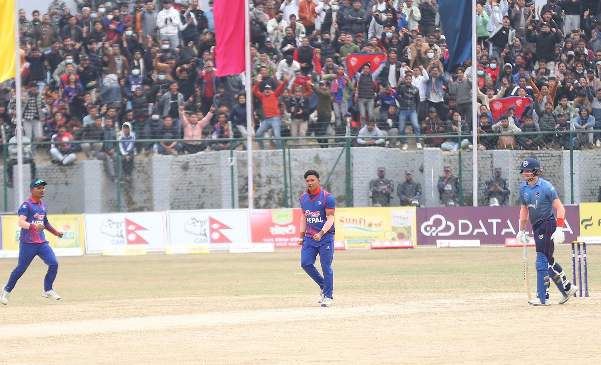 ३५औं ओभरमा भीम सार्की स्कोल्जबाट बोल्ड भए। उनले २६ रन बनाए।