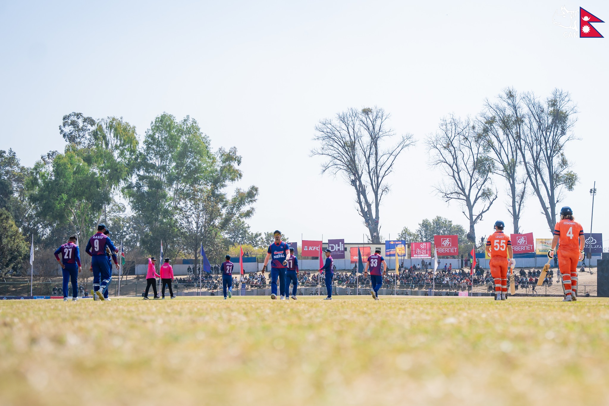 नेपालका लागि करण केसीले पहिलो विकेट लिए। उनले म्याक्स ओ'डाउदलाई दीपेन्द्रसिंह ऐरीबाट ४ रनमा क्याच गराए।