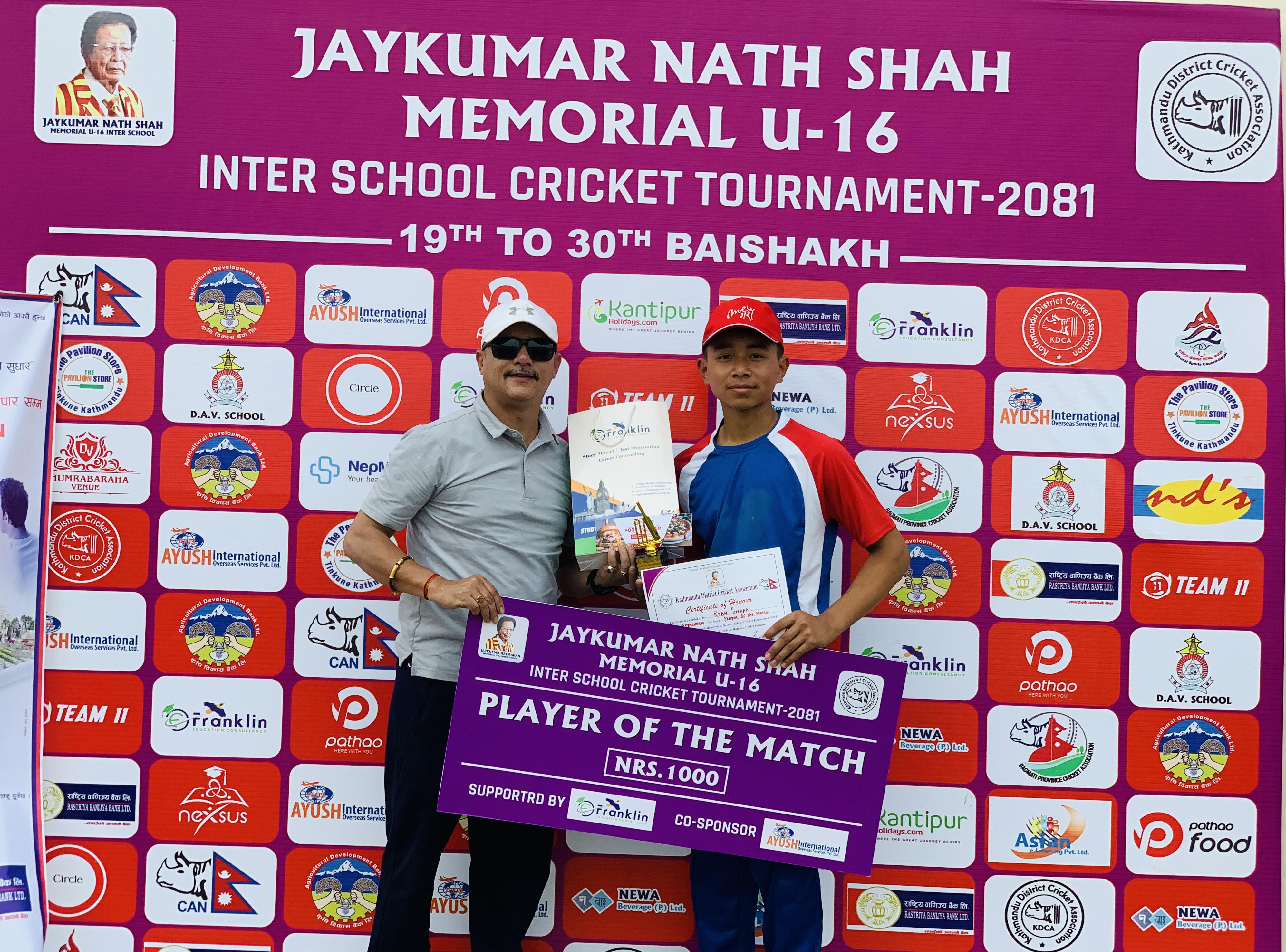 जयकुमार नाथ शाह मेमोरियल यू-१६ अन्तर स्कुल क्रिकेट प्रतियोगितामा शैनिक आवासीय महाविद्यालय र आलोक विद्याश्रम स्कुलले शुक्रबार जित हात पारेका छन्।