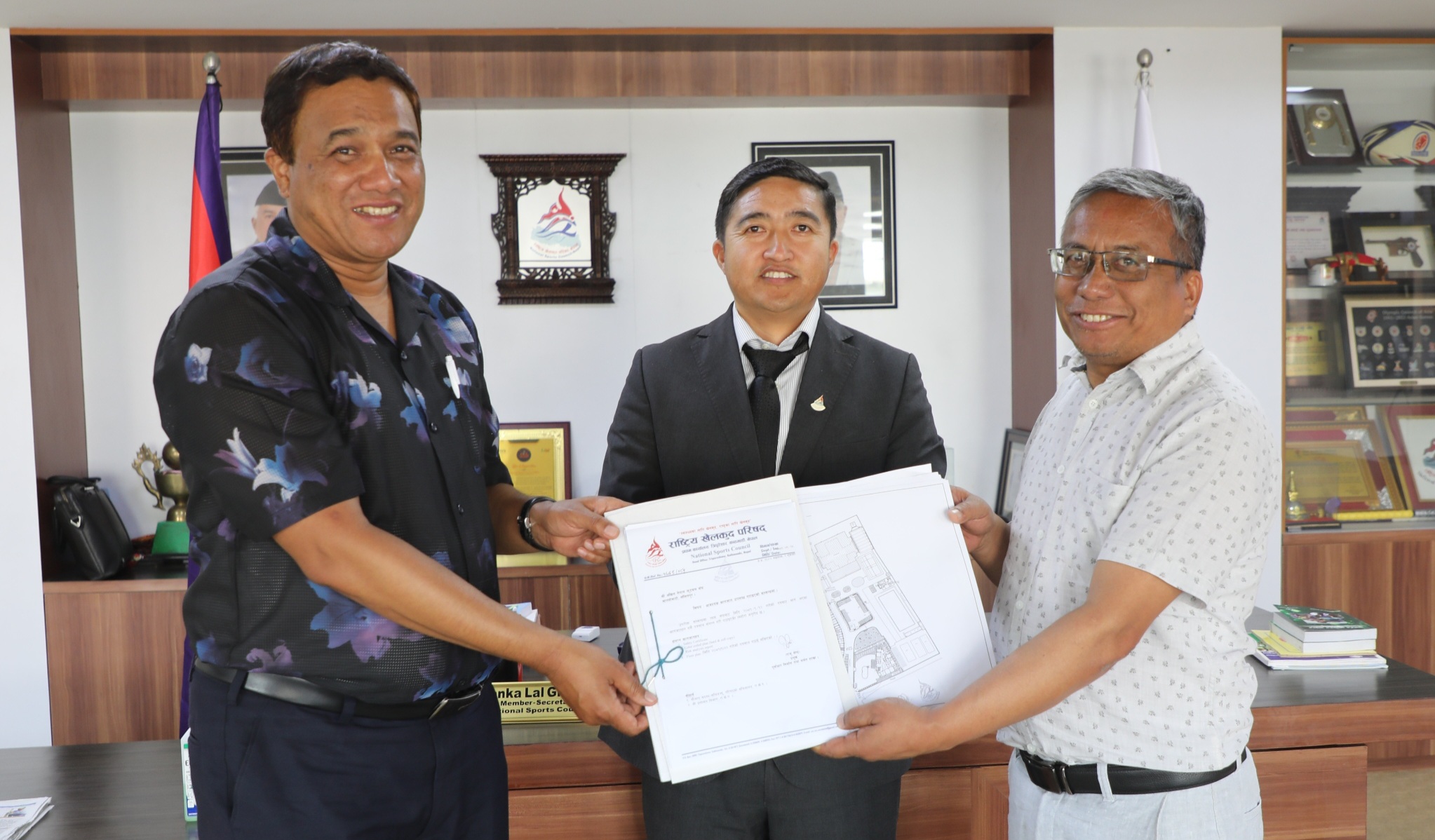 सदस्य–सचिव टंकलाल घिसिङको उपस्थितिमा राखेपअन्तर्गत पूर्वाधार निर्माण तथा मर्मत शाखाका प्रमुख राजु श्रेष्ठले एन्फाका प्रमुख कार्यकारी अधिकृत इन्द्रमान तुलाधरलाई विवरण हस्तान्तरण गर्नु भयो ।