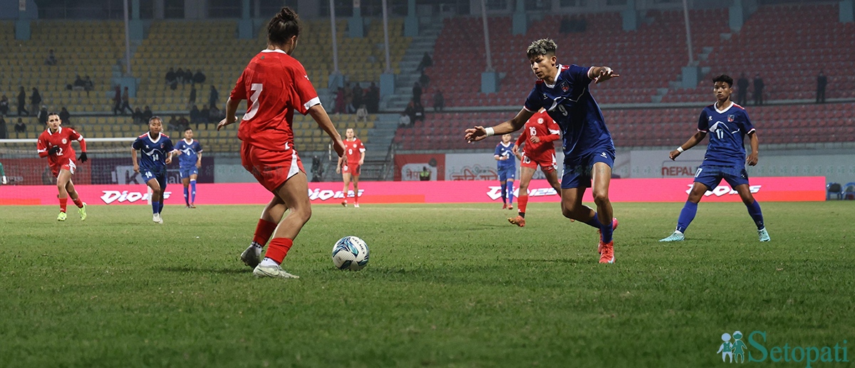 दशरथ रंगशालामा भइरहेको खेलमा नेपालले सावित्रा भण्डारी 'साम्बा'को गोलबाट पहिलो हाफमा १-० गोलको अग्रता लिएको हो।