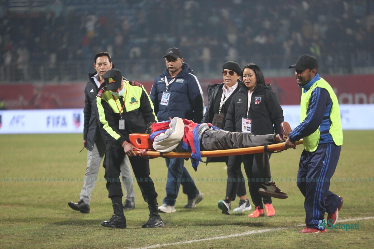 एकछिनपछि उनी खुट्टा समात्दै बसे। त्यसपछि उनलाई मैदानबाट स्ट्रेचरमा राख्दै प्लेयर बक्सतर्फ ल्याइएको थियो। अनि नेपाली टिमका फिजिओले उनको खुट्टा हेरेका थिए।