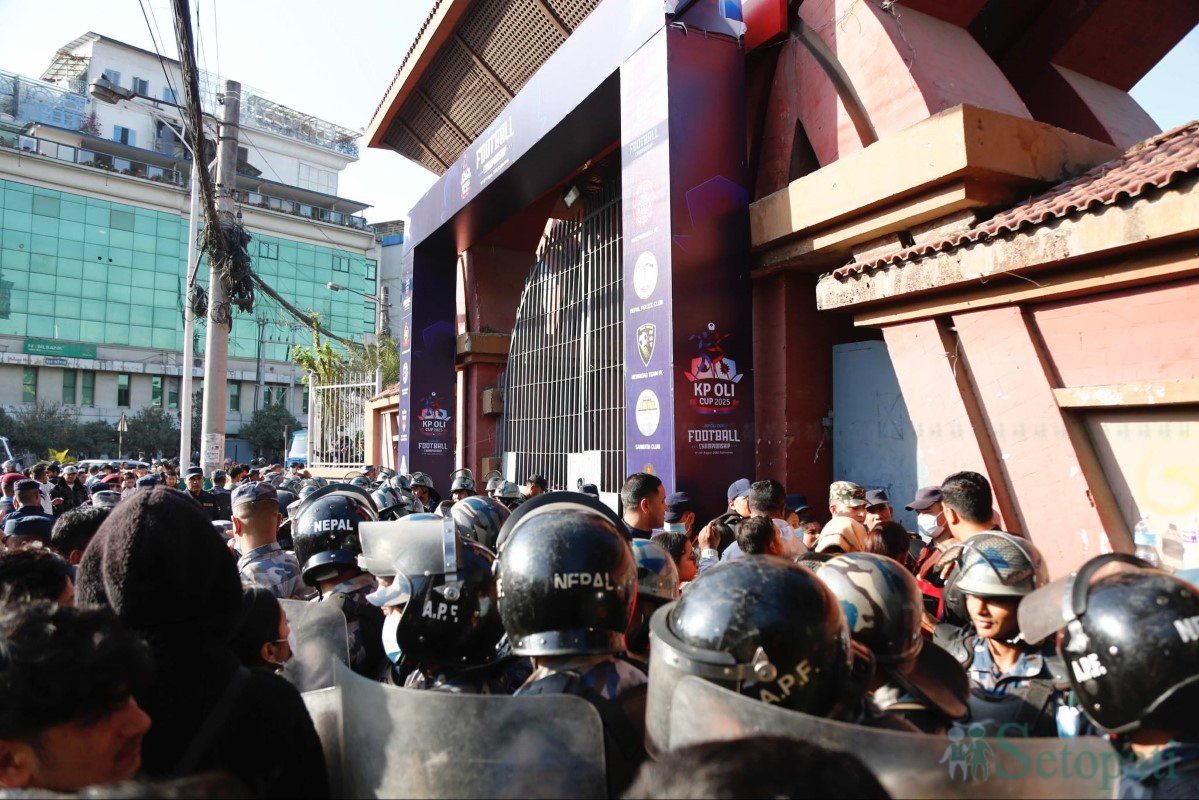 अफिसियललाई समेत भित्र पस्न कठिन परेको छ। क्षमताभन्दा बढी पास वितरण गर्दा अहिले रंगशाला बाहिरको क्षेत्र अस्तव्यस्त बनेको छ भने प्रहरीलाई भिड नियन्त्रणमा लिन हम्मेहम्मे परेको छ।