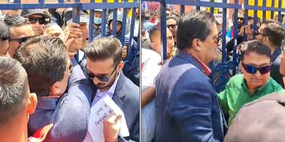 त्यसपछि आक्रोशित बनेका थापा र उनका जेठा छोरा गौरव थापासहितको समूहले गेटमा विरोध गरेका छन्।