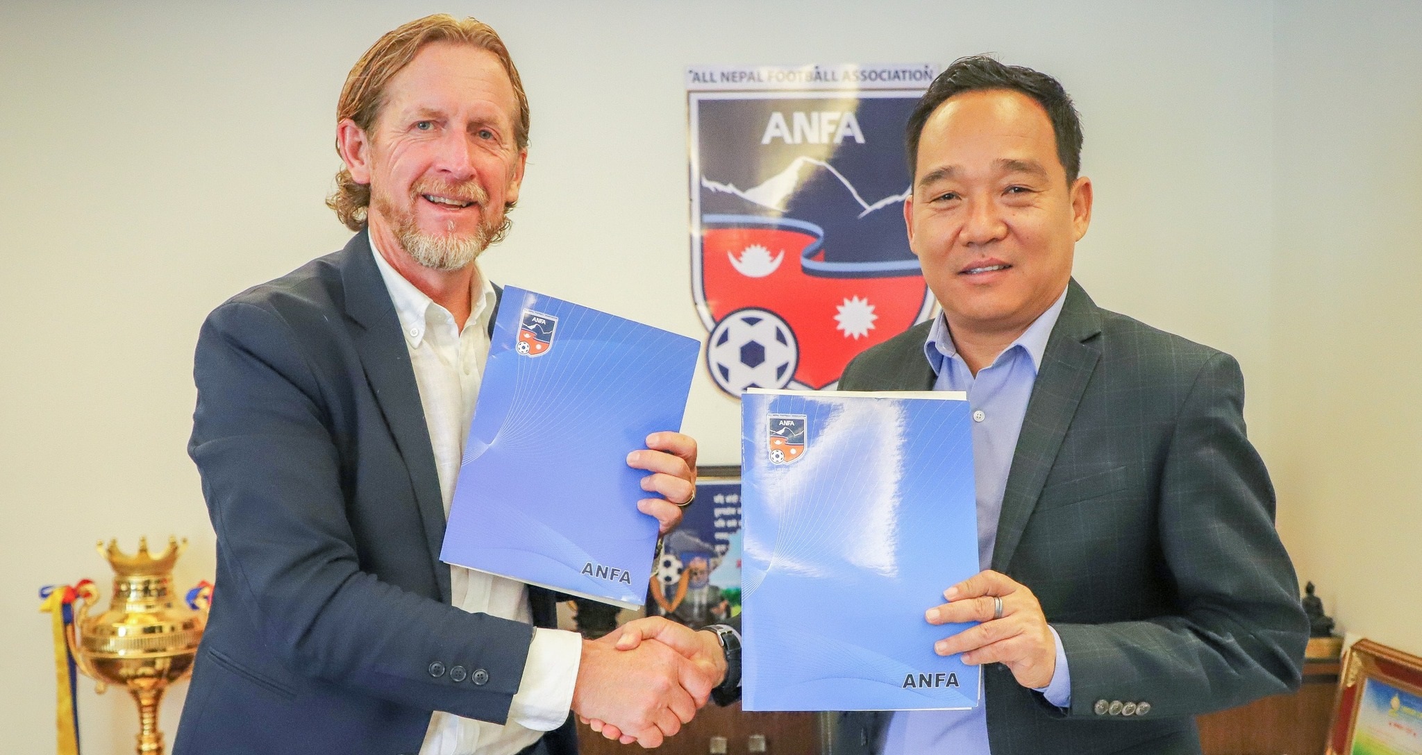 नवनियुक्त मुख्य प्रशिक्षकलाई अखिल नेपाल फुटबल संघका महासचिव किरण राईले आज एन्फा कम्प्लेक्स सातदोबाटोमा नियुक्तिपत्र हस्तान्तरण गरेका छन्।