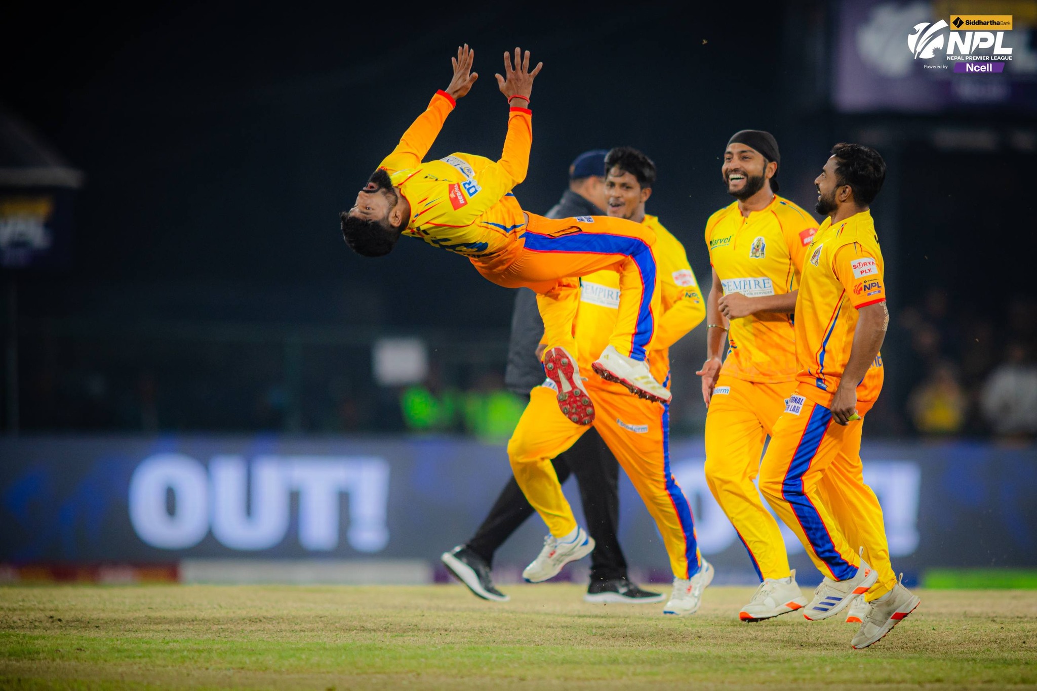 एनपिएल डेब्यू गरेका पुनित मेहराले १३ रन बनाए। मेहरा र पाण्डेलाई चितवनका सइफ जइबले क्याच गराउँदा डेब्यू इंग्लिस बलर जर्ज स्कृमशले हर्मितलाई आउट गरे। अन्त्यमा कप्तान दीपेन्द्रसिंह ऐरीले १४ बलमा नटआउट २४ रन र आरिफ शेखले १६ बलमा नटआउट २४ रन बनाए।