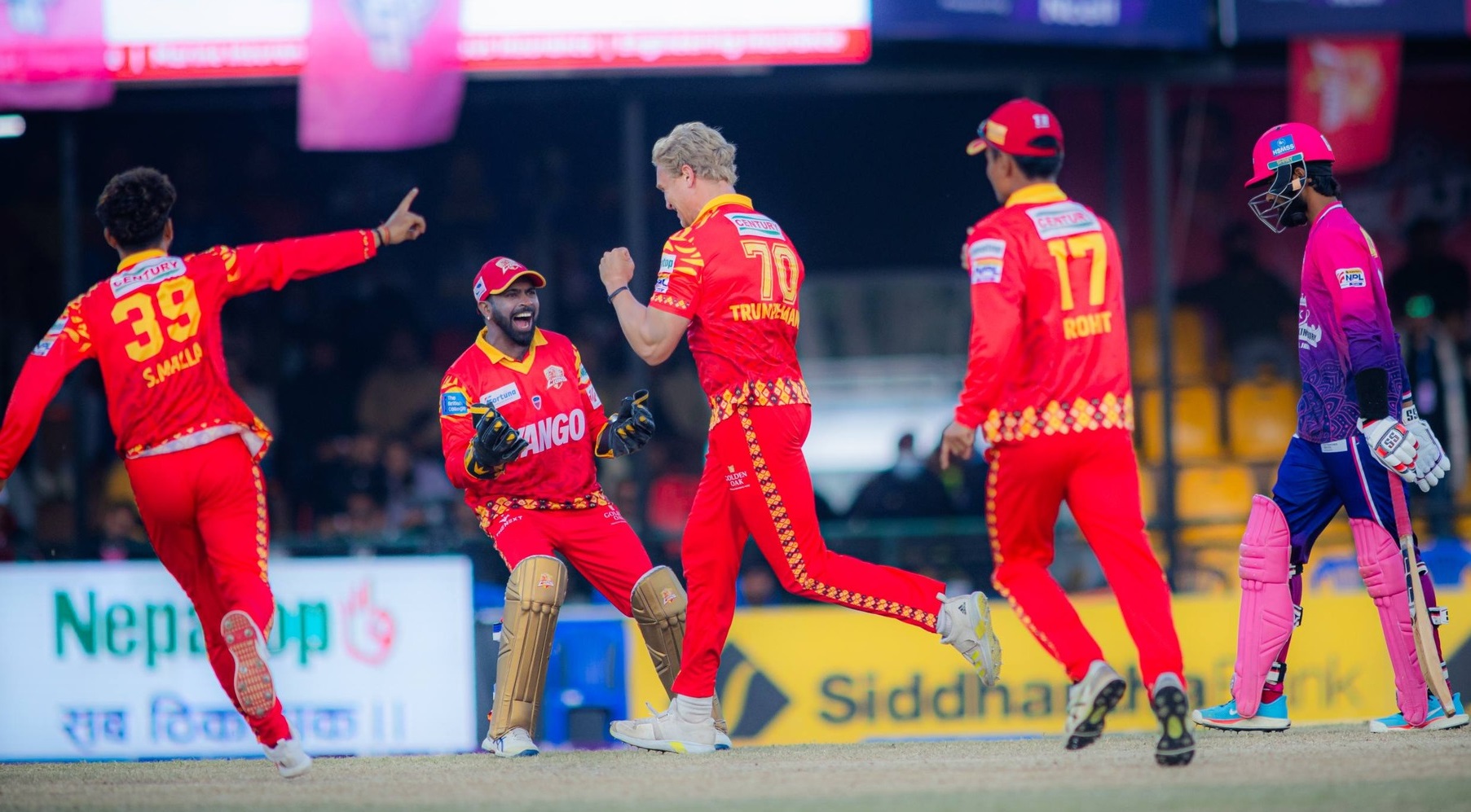 शुभ कंसाकारले ११ रन जोड्न सके। लुम्बिनीका कप्तान रोहितकुमार पौडेलले १४औं ओभरमा लगातार २ विकेट लिए।उनले दोस्रो बलमा सञ्जय कृष्णमूर्तिलाई डार्शी सटबाट क्याच गराए। उनले ११ बलमा १४ रनको योगदान गरे। लगत्तै अर्को बलमा कप्तानको भूमिकामा रहेका यान निकोल लफ्टी इटन एलबिडब्लूको धरापमा परे।