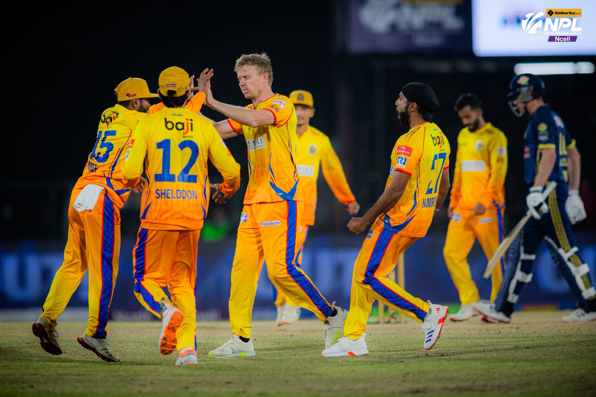 सन्दीप लामिछाने (कप्तान), लोकेश बम (विकेटकिपर), प्रतिश जिसी, बसिर अहमद, सूर्य तामाङ, नरेन भट्ट, नारायण जोशी, फाप डु प्लेसिस, मार्टिन गप्टिल, साम हिजलेट, मर्स्याङ डि लाङ।
