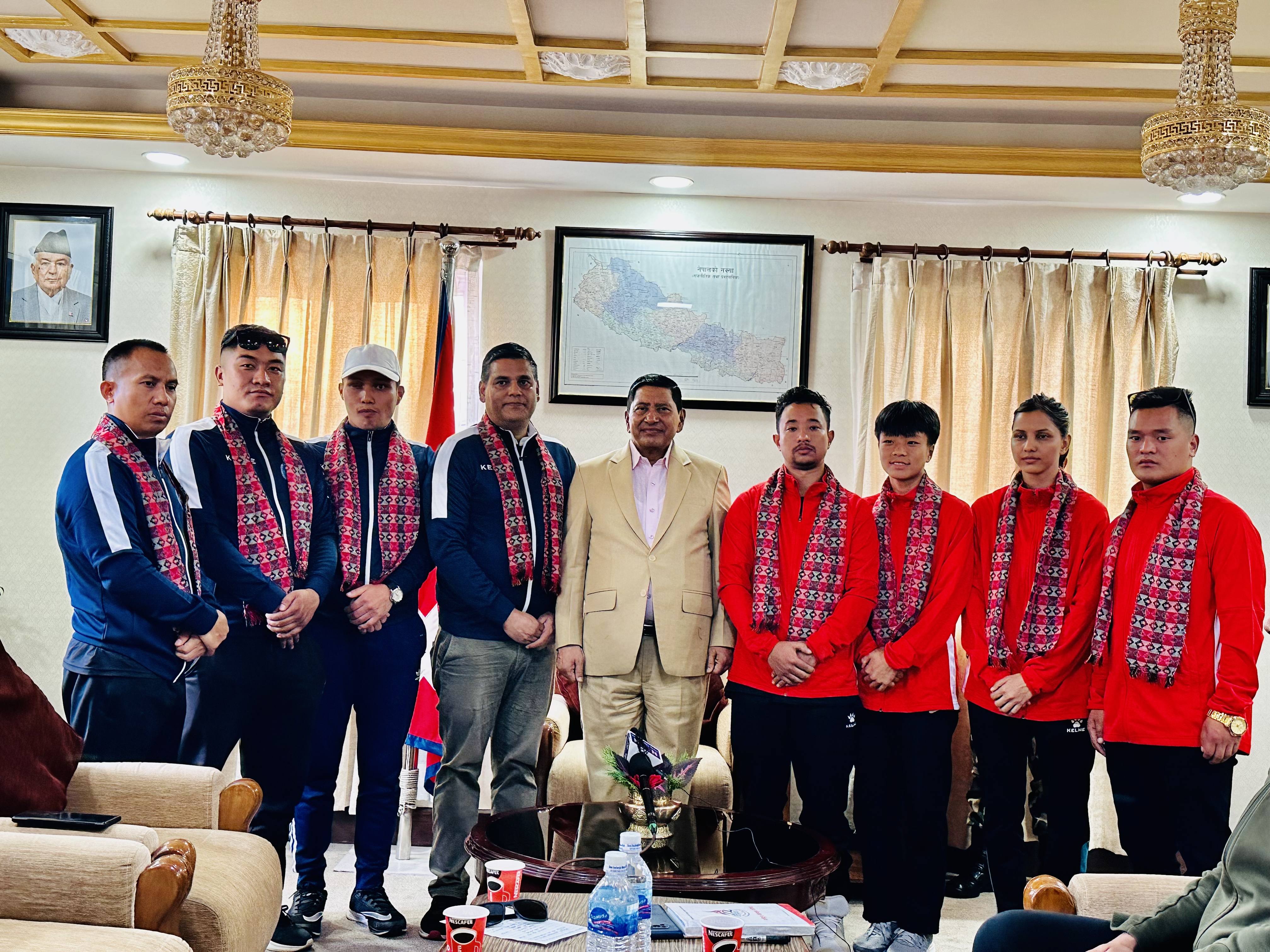 काजकिस्तानमा हुने विश्व च्याम्पियनसिपमा सहभागी हुन जाने ८ सदस्यीय नेपाली टोलीलाई बुधबार उपप्रधान तथा गृहमन्त्री नारायणकाजी श्रेष्ठले बिदाइ गर्नु भएको थियो । सिंहदरबारस्थित मन्त्रालयमा आयोजित कार्यक्रममा गृहमन्त्री श्रेष्ठले पछिल्ला समय नेपाली खेलकुदको विकास भइरहेको उल्लेख गर्दै त्यसमा नेपाली खेलाडीको भूमिका महत्वपूर्ण रहेको बताए । बाइट.... नारायणकाजी श्रेष्ठ, उपप्रधान तथा गृहमन्त्री मन्त्री
