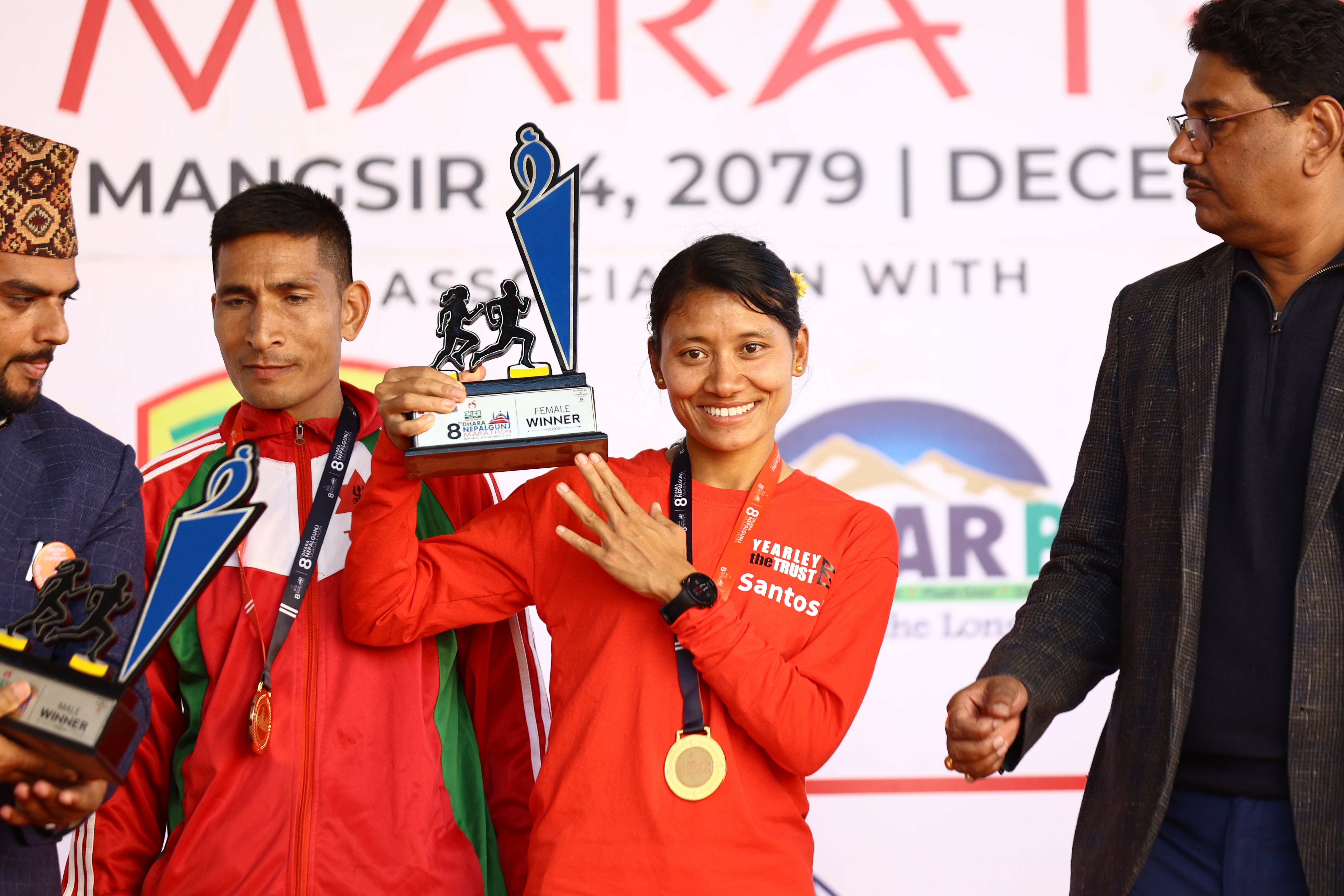 नेपालगन्ज म्याराथनको पहिलो संस्करणमा नेपाली सेनाका होमलाल श्रेष्ठ विजेता बनेका थिए। त्यसैगरी दोस्रोमा सेनाकै कृष्ण बस्नेत, तेस्रोमा जुम्लानिवासी भारतीय गोर्खा सेनामा कार्यरत दुर्गाबहादुर बुढा, चौथोमा नेपाल पुलिस क्लबका भुमिराज राई, पाँचौंमा सेनाका भिमबहादुर साउद, छैठौंमा नेपाल एपीएफ क्लबका गोपीचन्द्र पार्की, सातौंमा एपीएफकै किरणसिंह बोगटी र आठौंमा सेनाकै खडकबहादुर खड्का विजेता बनेका थिए भने महिला हाफ म्याराथनतर्फ सातौं र आठौं संस्करणमा गोल्डेन गर्ल सन्तोषी श्रेष्ठ च्याम्पियन बनेकी थिइन । त्यसैगरी पहिलो एपीएफका कृष्णेस्वरी सिन्तकला, दोस्रोमा एपीएफकी कान्छीमाया कोजु, तेस्रोमा आर्मीकी रेशु बस्नेत, चौथोमा एपीएफकै कान्छीमाया कोजु, पाँचौंमा आर्मीकी पुर्णलक्ष्मी न्यौपाने, छैटौंमा एपीएफकी पुष्पा भण्डारी विजेता बनेका थिए । दुई संस्करण जित्ने खेलाडी कान्छीमाया कोजु र सन्तोषी श्रेष्ठ हुन्।