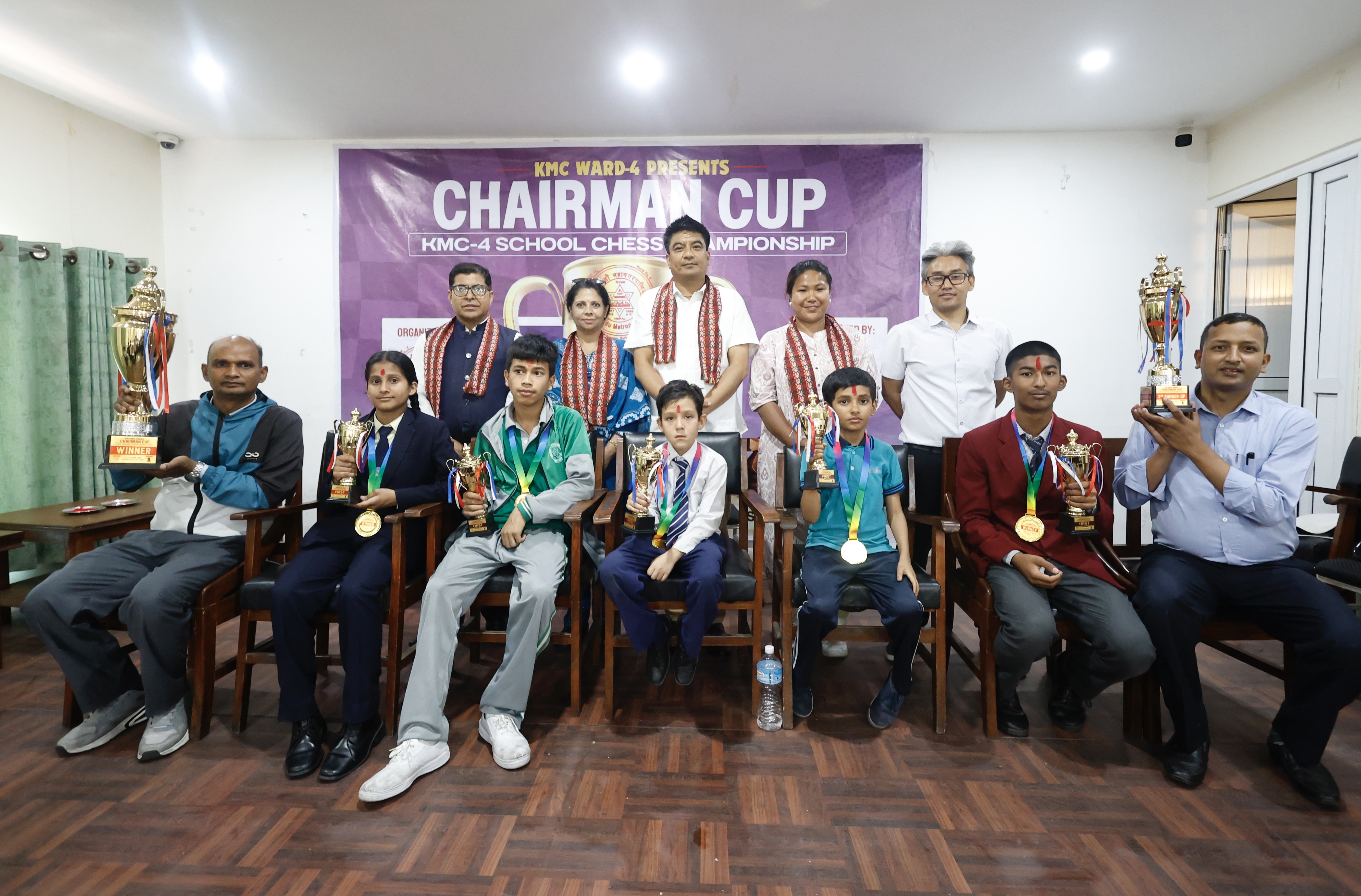 बलुवाटारस्थित महेन्द्र राष्ट्रिय माविको हलमा आयोजित प्रतियोगिताका च्याम्पियन तथा विभिन्न ६ स्पर्धाका विजेताहरूलाई काठमाडौं महानगरपालिका ४ का वडाध्यक्ष दिनेश महर्जन, चेसकी पहिलो महिला राष्ट्रिय च्याम्पियन मोनालिशा खम्बूलगायतले ट्रफी, मेडल तथा प्रमाणपत्र प्रदान गरे ।