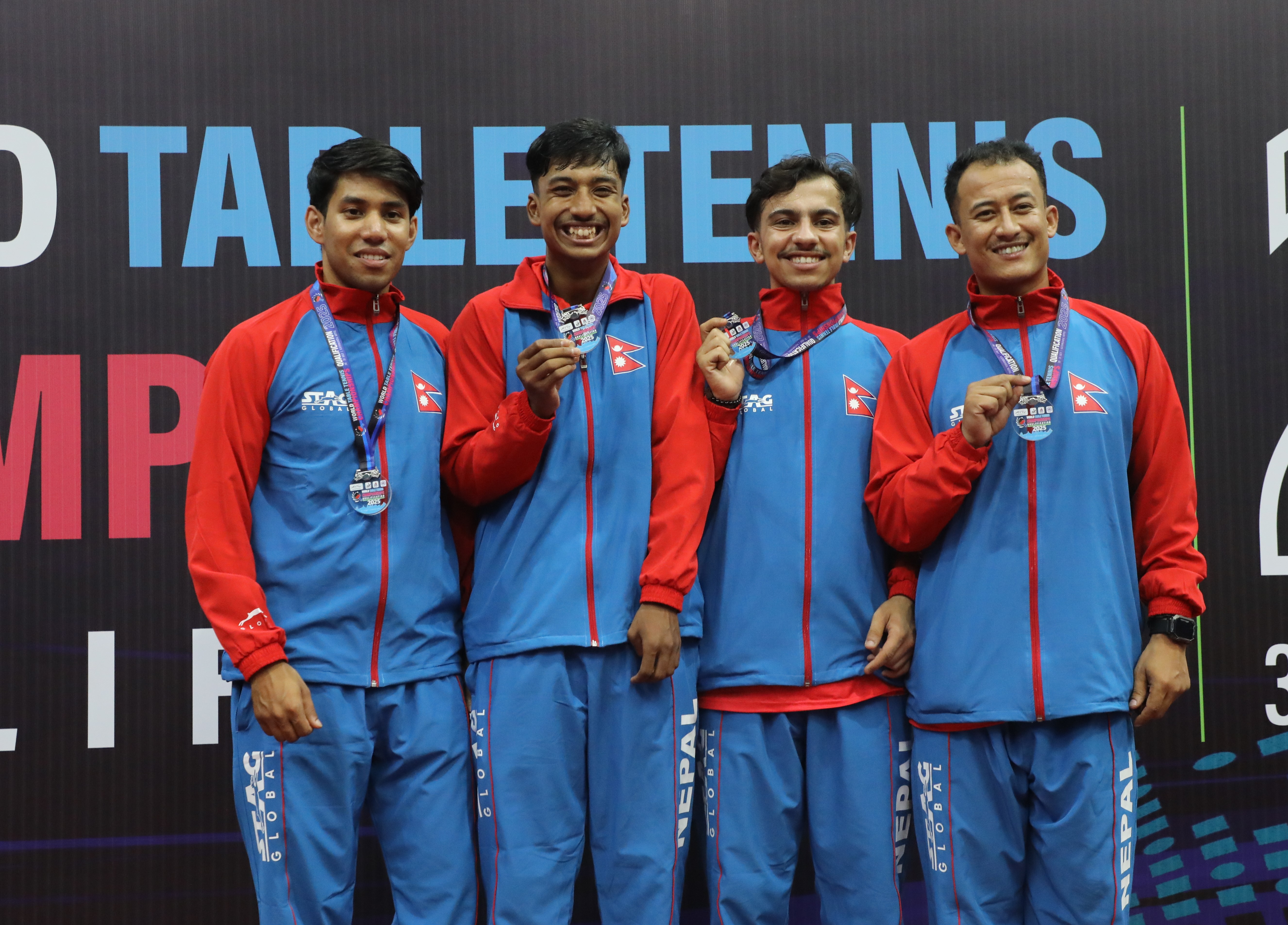 अखिल नेपाल टेबलटेनिस संघद्वारा आयोजित प्रतियोगिताको पुरुषमा नेपाल ७ अंकसाथ नेपाल दोश्रो भयो । भारतसँग मात्र चुकेको नेपालले पहिलो दिन बुधबार श्रीलंकालाई ३–०, माल्दिभ्सलाई ३–१ र बंगलादेशलाई ३–२ को सेटमा पराजित गरेको थियो । माल्दिभ्स र श्रीलंका तेश्रो भए ।