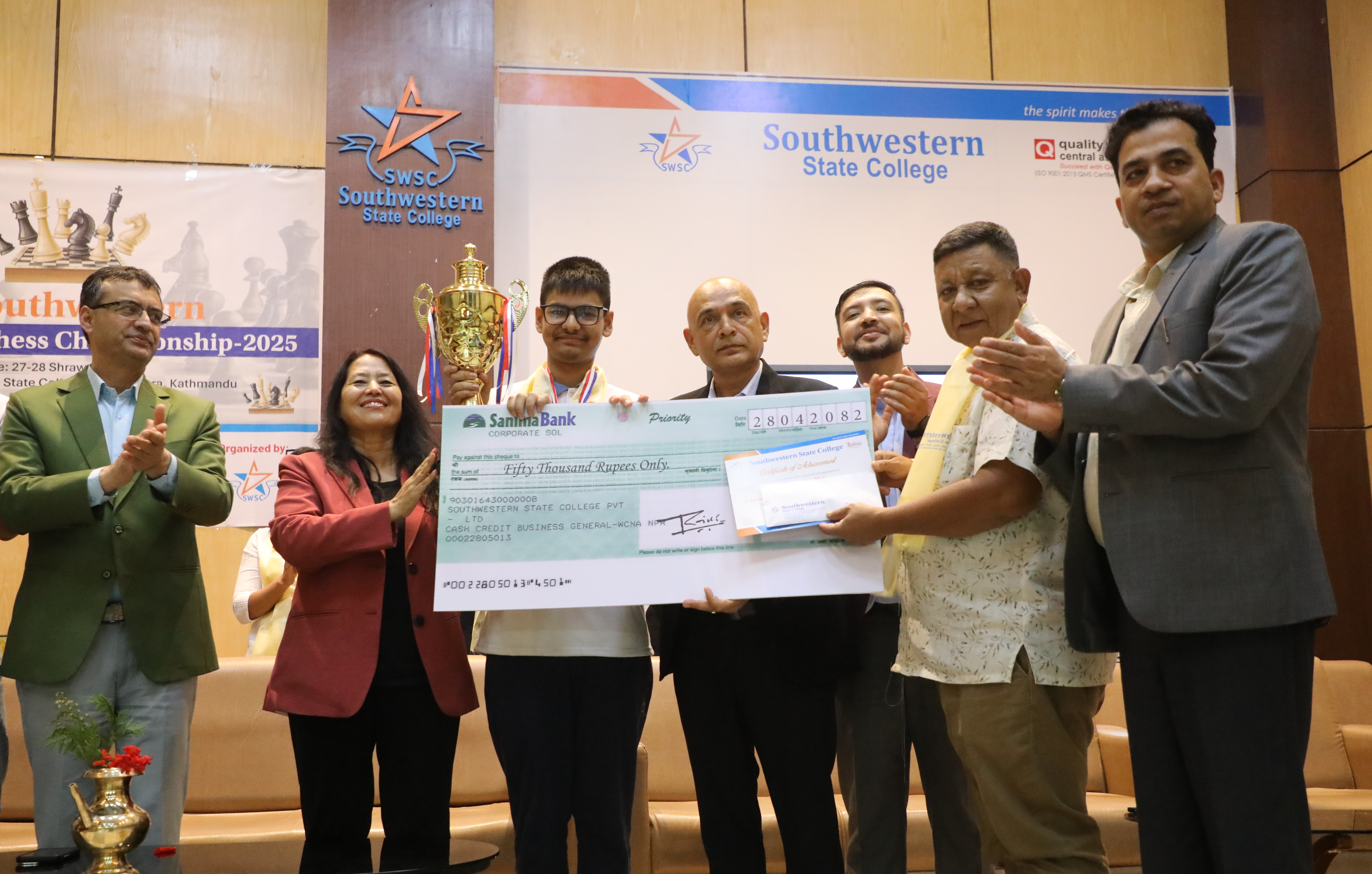 विजेतालाई टोखा नगरपालिका वडा ७ का अध्यक्ष नरोत्तम राना, आयोजक साउथ वेस्टर्नका क्याम्पस प्रमुख डा. राजेन्द्र केसी, साउथ वेस्टर्नका भाइस प्रिन्सिपल हरिसिंह केसी, इन्टरनेसनल रिलेसन को–ओर्डिनेटर सरिता शाक्यलगायतले एक कार्यक्रमबीच पुरस्कृत गरे ।