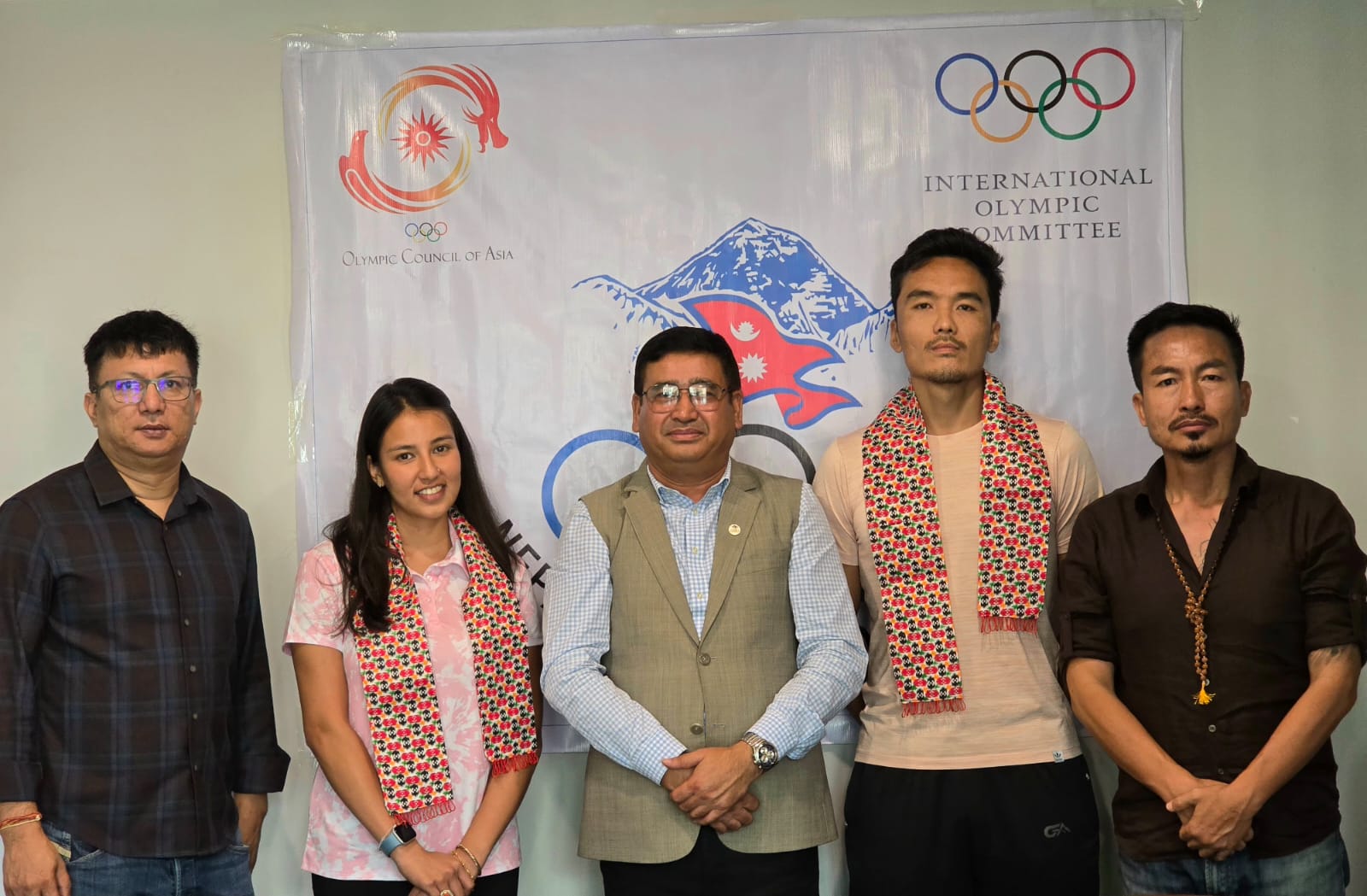 नेपाल ओलम्पिक कमिटीका अध्यक्ष जीवनराम श्रेष्ठ र महासचिव राजीव श्रेष्ठले बिदाइ गरे।