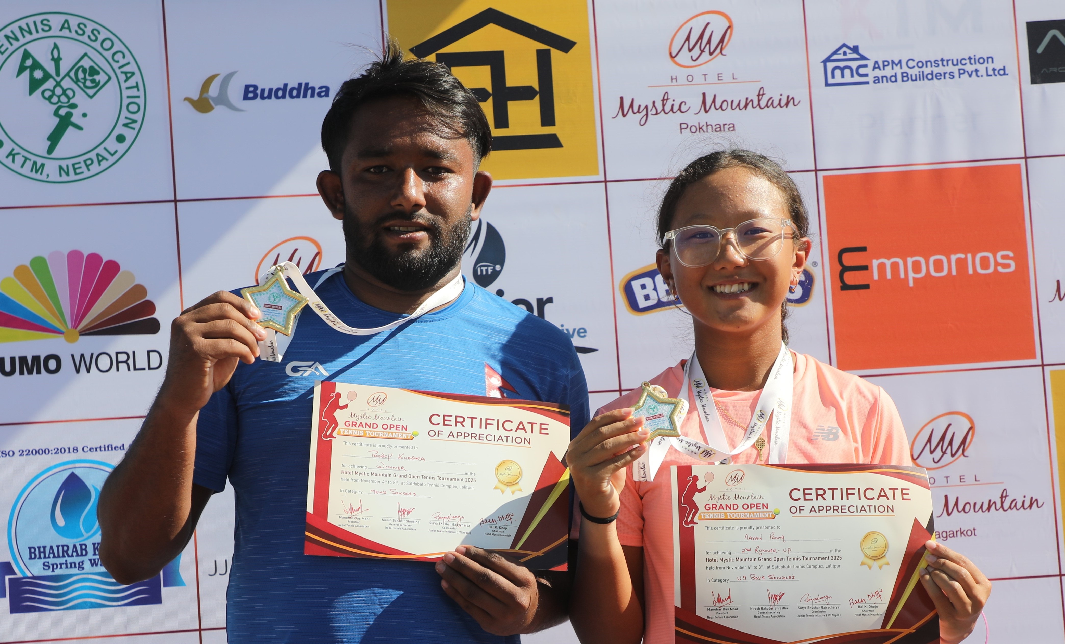 नेपाल नम्बर वान प्रदीप खड्का र शिभाली गुरुङले होटल मिस्टिक माउन्टेन ग्रान्ड ओपन टेनिस प्रतियोगिताको सिंगल्स उपाधि शनिबार जितेका छन्।