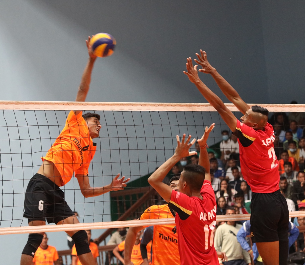 लगातार दुई सेट आफ्नो पक्षमा पारेको आर्मीले २५–२३ र २५–१२ को प्रदर्शन ग¥यो। एपीएफले तेश्रो सेट २५–२२ र चौथो सेट २५–२३ ले जित्दै खेललाई २–२ को बराबरीमा पुर्याएको थियो। पाँचौं तथा निर्णायक सेट १५–१० ले कब्जा गर्दै एपीएफले फाइनलमा स्थान सुनिश्चित गर्यो।
