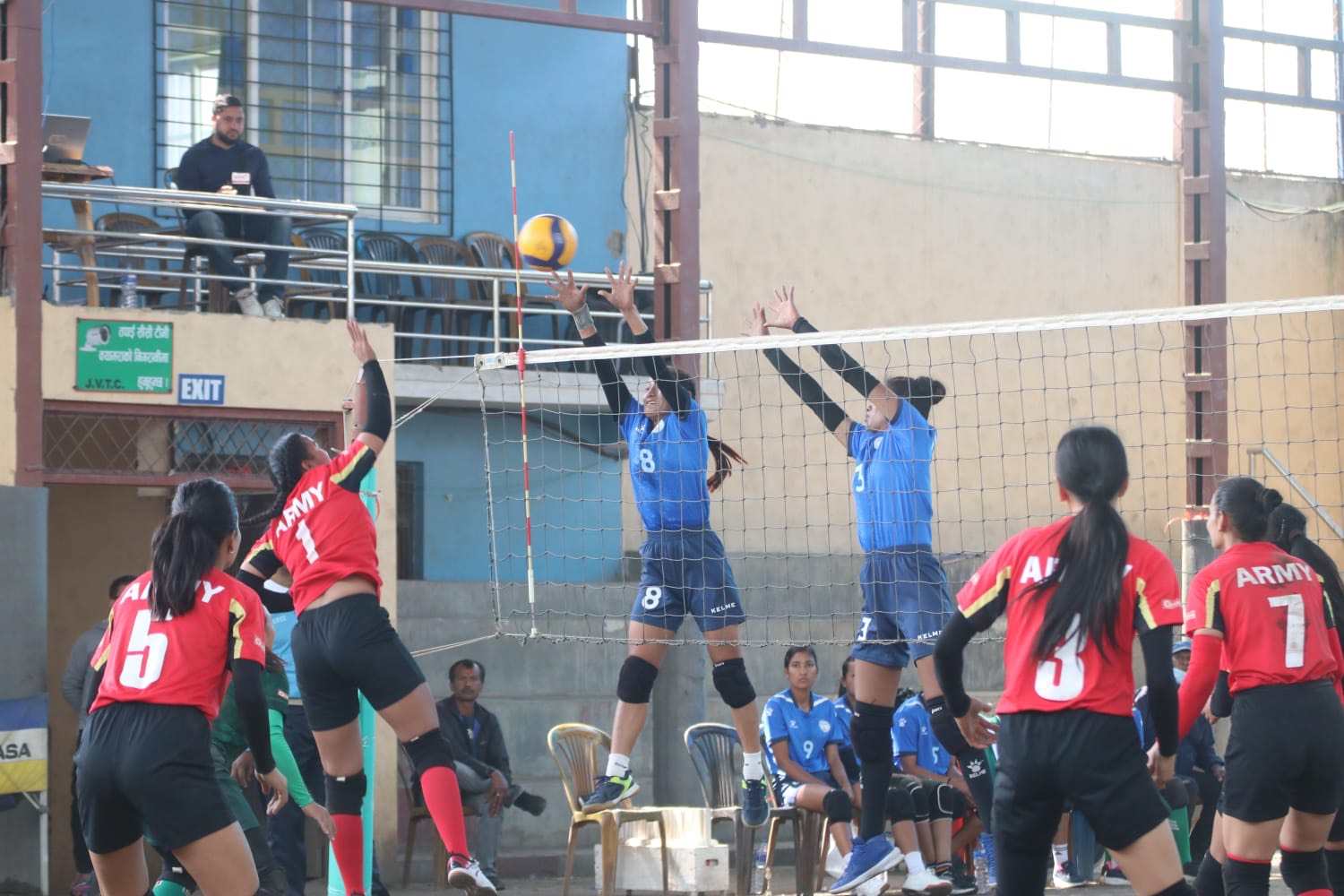 समूह ‘ए’कोे खेलमा पुलिसले चार अंक जोड्यो । आर्मीले मात्र दुई अंक जोड्यो । कोटेश्वर बहुमुखी क्याम्पस अंक विहिन भयो । महिलातर्फको अर्को खेलमा ललितपुर महानगरपालिकाले परोपकार गल्स होस्टेललाई ३–२ को सेटमा पाखा लगायो । ललितपुरले परोपकारलाई २६–२४, २५–१७, २३–२५, २८–३० र १५–१३ को सेटमा हरायो ।