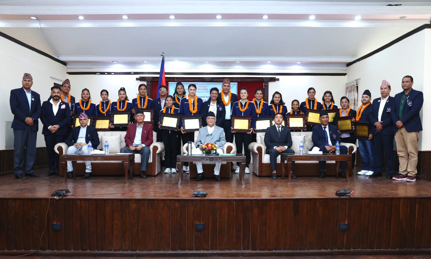 प्रधानमन्त्री केपी शर्मा ओलीले ‘काभा वुमन्स भलिबल नेसन्स् लिग, २०२४’ मा सहभागी राष्ट्रिय महिला भलिबल खेलाडी, प्रशिक्षक र व्यवस्थापकलाई पुरस्कृत गरेका छन्।