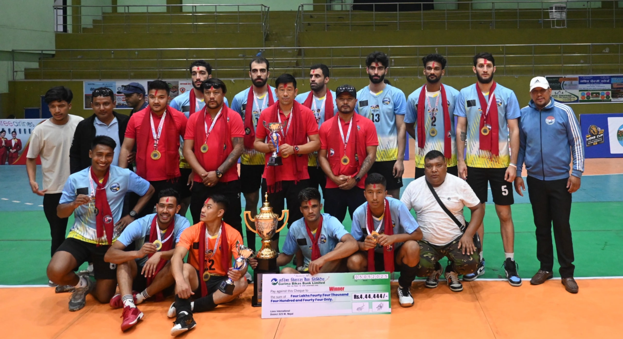 पोखरामा सञ्चालित प्रथम लायन्स कप राष्ट्रिय तथा अन्तर्राष्ट्रिय आमन्त्रित पुरुष भलिबल प्रतियोगिताको उपाधि जितेको छ।